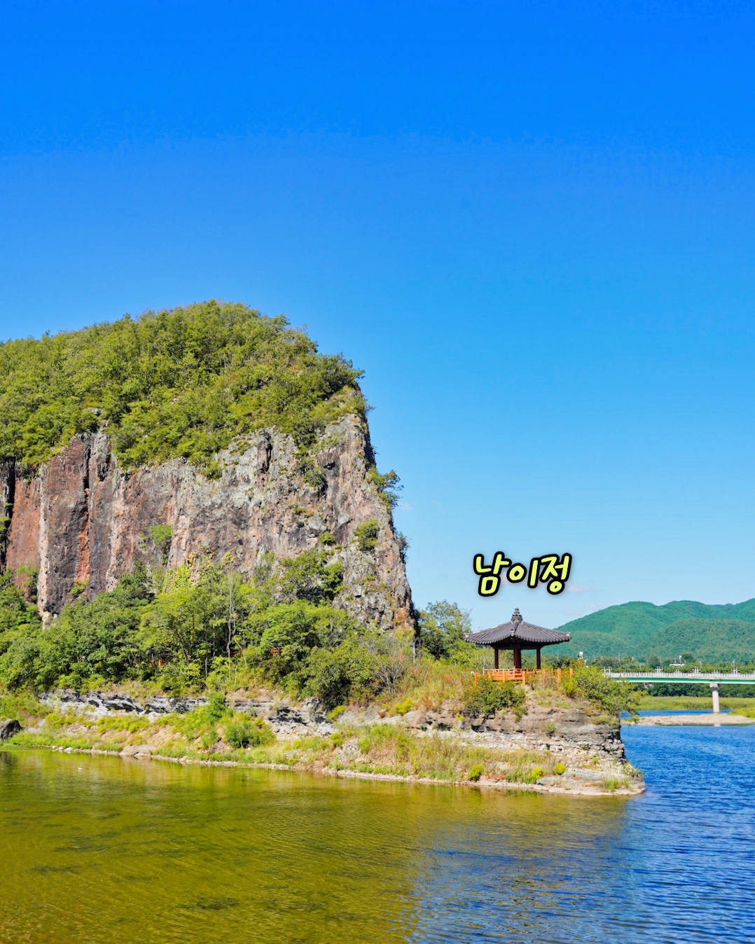 - 도로 옆에 촛대처럼 우뚝 솟아 있는 선바위, 절벽에 자리한 남이정, 남이정까지 이어지는 산책로까지